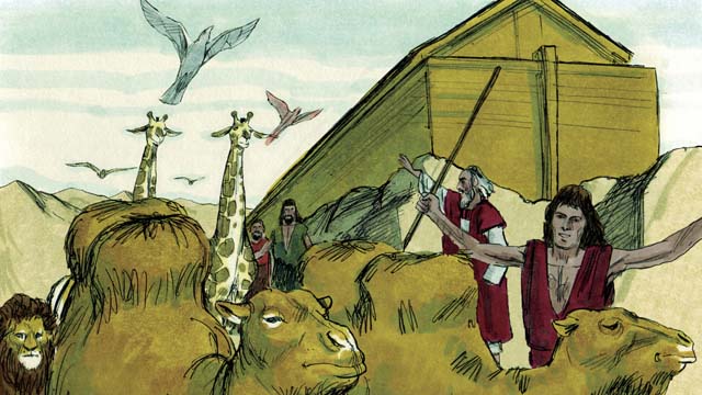 परमेश्वर ने हर जानवर और पक्षी के नर और मादा को नूह के पास भेजा ताकि वे नाव में जा सकें और बाढ़ के दौरान सुरक्षित रह सकें। परमेश्वर ने ऐसे हर प्रकार के जानवरों के सात नर और सात मादाओं को भेजा जिनको बलि चढ़ाने के लिए उपयोग किया जा सके। जब वे सब नाव में पहुँच गए तो स्वयं परमेश्वर ने नाव के द्वार को बंद कर दिया।