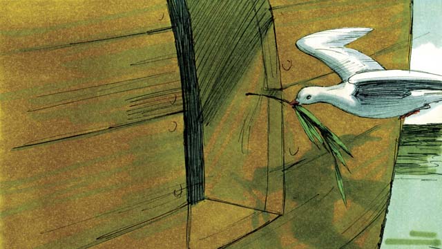 फिर बाद में नूह ने एक कबूतरी को बाहर भेजा। परन्तु उसे भी कोई सूखी भूमि न मिली, इसलिए वह नूह के पास वापिस आ गई। एक सप्ताह के बाद उसने उस कबूतरी को फिर से भेजा, और वह अपने चोंच में जैतून की एक शाखा लिए हुए वापिस आई। पानी घट रहा था, और पौधे फिर से उगने लगे थे।